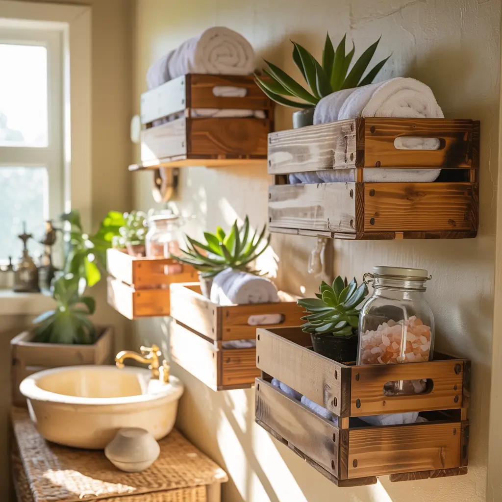 My crate phase started at a farmers market where old apple crates cost basically nothing. Mounted on bathroom walls, they became the perfect mix of storage and decor that guests always compliment.