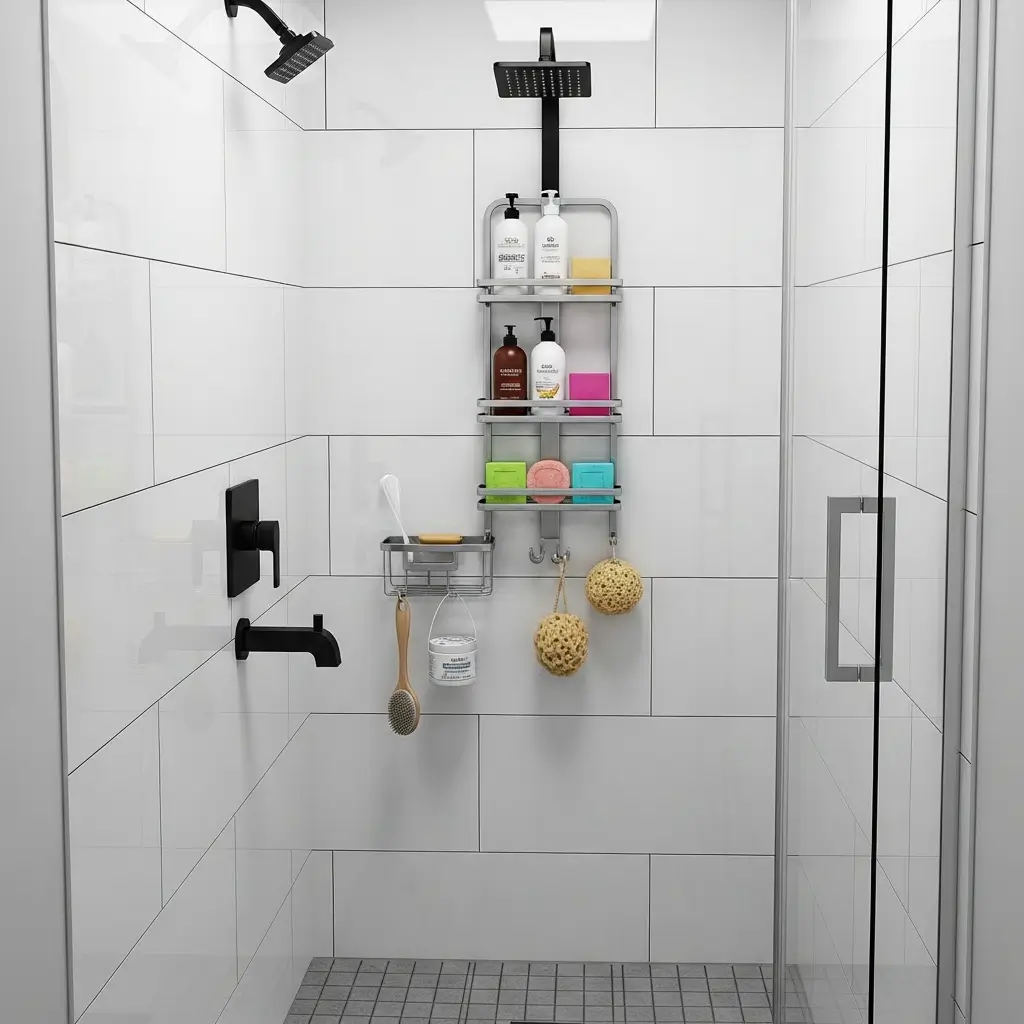 After my old caddy fell one too many times (nothing like a shampoo avalanche to wake you up), I switched to a hanging version. Mine has two tiers plus hooks for loofahs and razors. Everything stays put, drains properly, and I can easily remove it for deep cleaning.