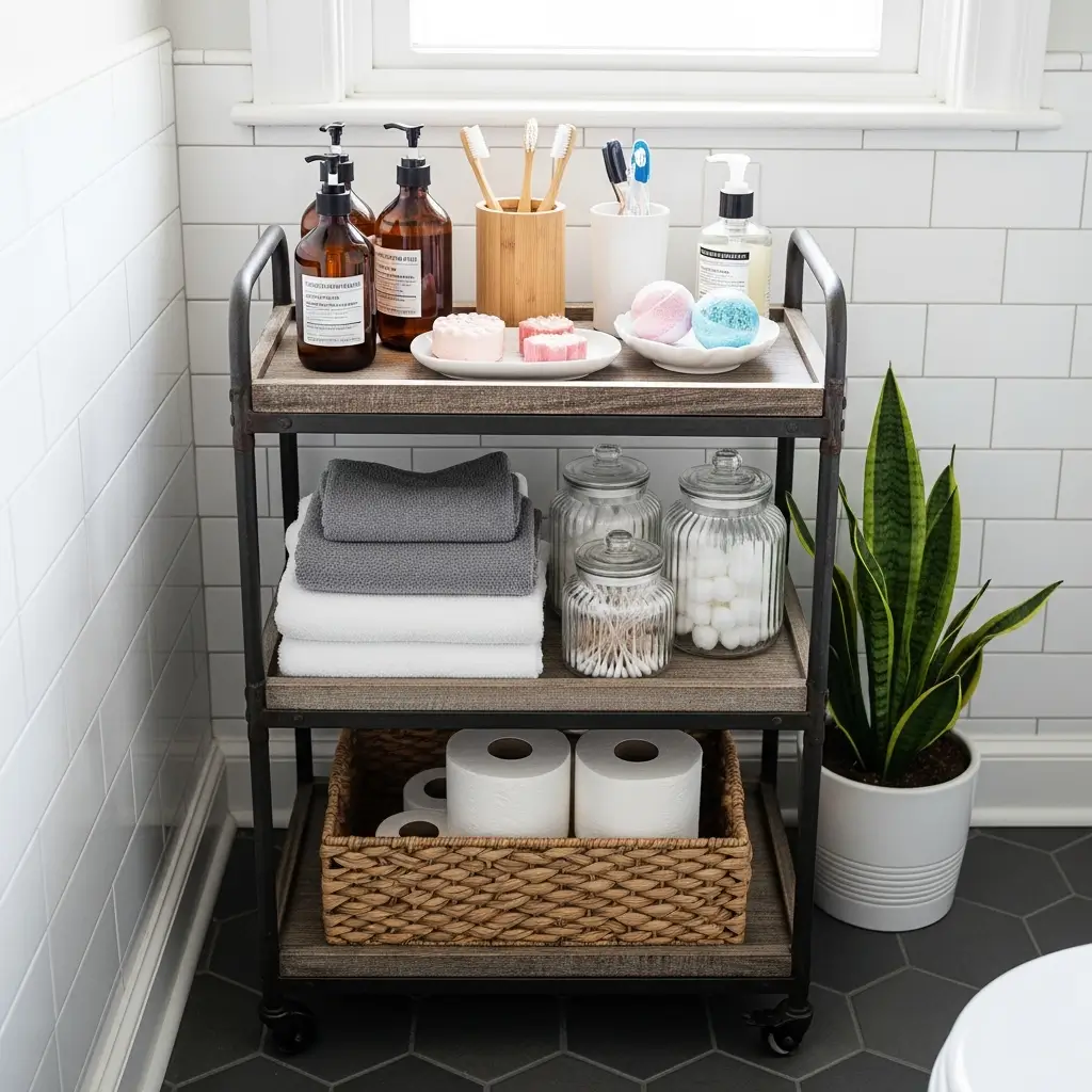 My three-tier cart lives between the toilet and vanity, holding everything from hair tools to extra toilet paper. When I deep clean, I just roll it out. When getting ready, I pull it close. It’s like having a mobile assistant that holds all your stuff.