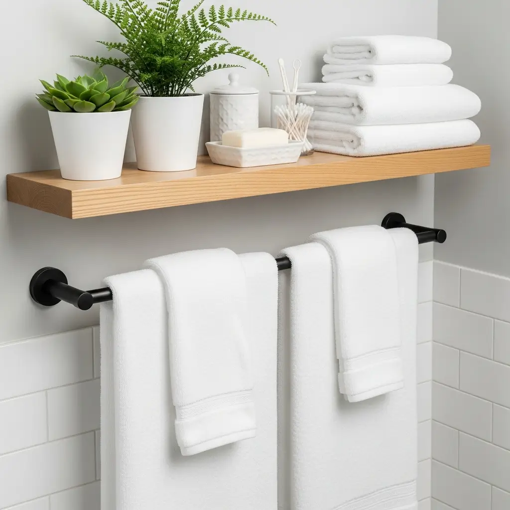 I replaced my basic towel bar with one that has a shelf on top. Now I have a spot for decorative items or everyday essentials right above where towels hang. It’s such a simple upgrade but makes a huge difference in both function and style.