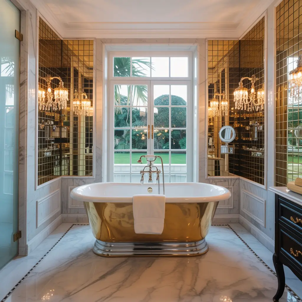 A strip of gold mosaic tiles in the shower? Stunning. Gold hexagons mixed randomly with white ones? Chef’s kiss. The key is restraint. Gold accents should whisper luxury, not scream it.