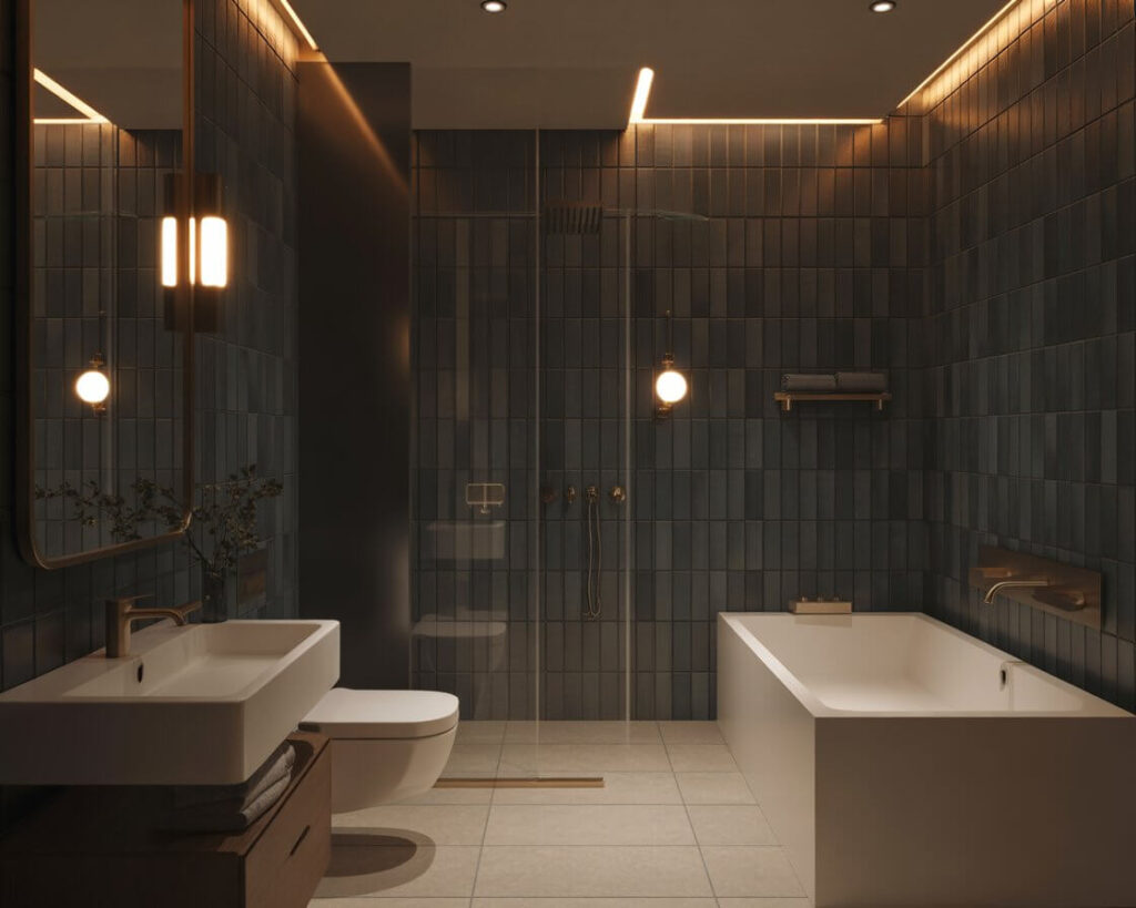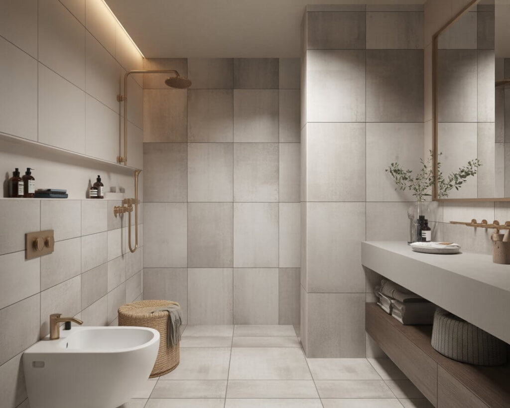 I paired large format concrete tiles with brass fixtures in my modern bathroom, and the contrast is stunning. They’re also incredibly practical – the matte finish hides water spots, and the neutral color goes with literally everything. Want to warm them up? Add wood accents and plush textiles.
