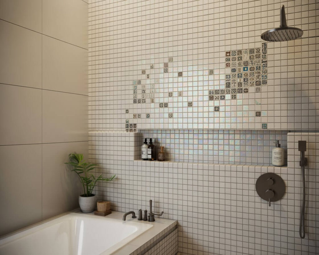 The beauty of mosaic tiles lies in their ability to create focal points. I used iridescent glass mosaics as an accent strip in my shower, and when the light hits them just right? Chef’s kiss. They’re perfect for shower niches, backsplashes, or accent walls where you want maximum impact without covering every surface.