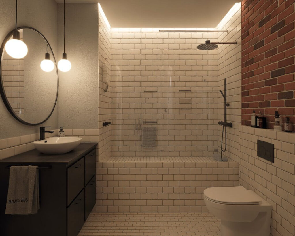 Exposed brick in bathrooms sounds questionable until you see it done right. Brick-style tiles give you that industrial loft vibe without the moisture problems of actual brick. They add texture and warmth that makes bathrooms feel less clinical.