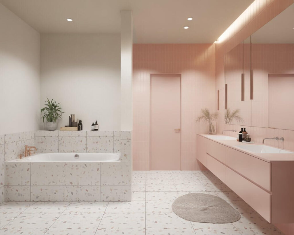 What makes modern terrazzo different from your grandma’s floor? The color combinations have gotten way more sophisticated. We’re talking subtle neutrals, bold jewel tones, and even metallic flecks. I recently saw a bathroom with pink terrazzo tiles that made my heart skip a beat – it was like millennial pink grew up and got sophisticated.