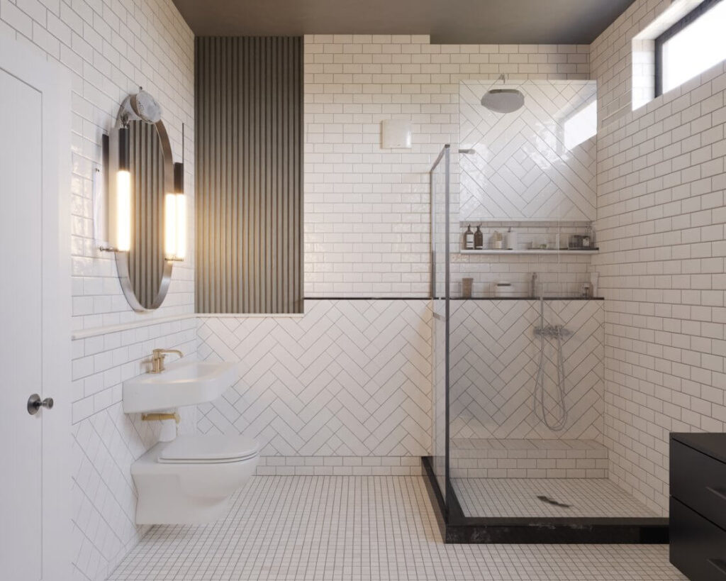 White subway tiles in herringbone remain classic, but don’t sleep on bold colors or contrasting grouts. I’ve seen black herringbone floors that look absolutely killer with white walls. The pattern works vertically too – perfect for shower walls or backsplashes where you want maximum drama.
