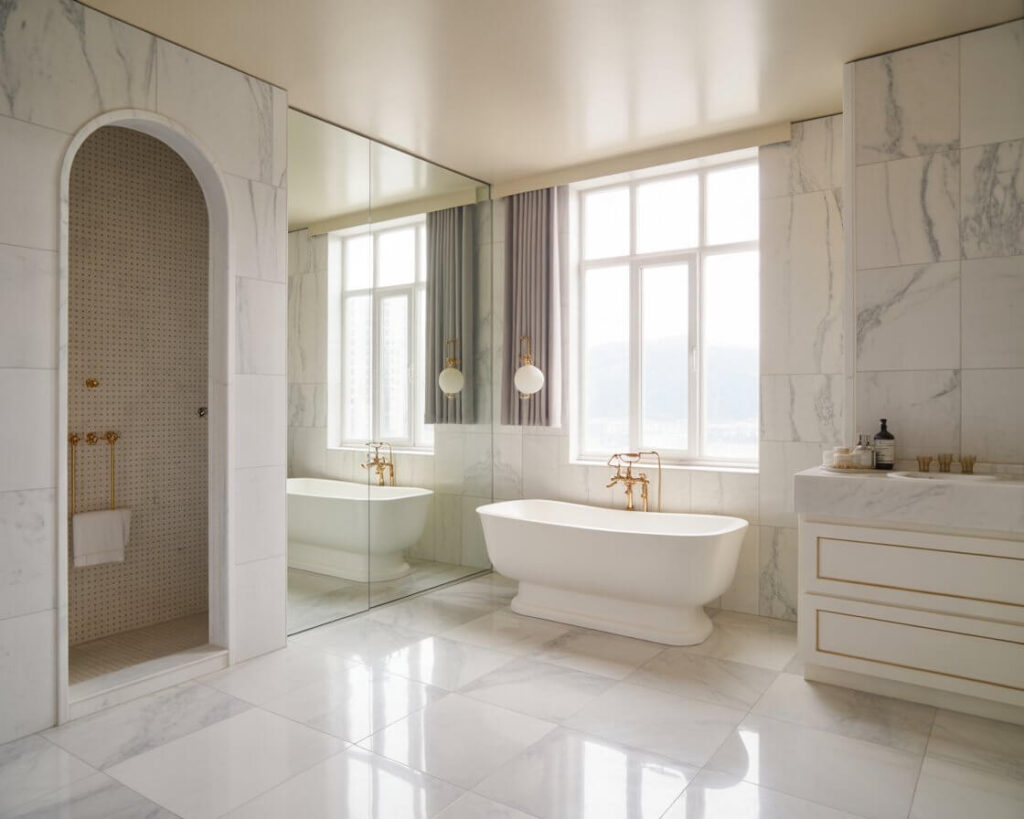 Natural marble requires sealing, careful cleaning, and accepting that it’ll develop character (aka stains and etches) over time. But here’s the thing – that imperfection is part of its charm. Each tile tells a story with its unique veining patterns. No two pieces are identical, which means your bathroom becomes a one-of-a-kind masterpiece.