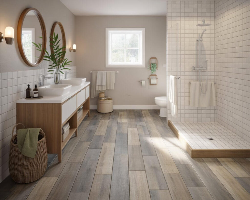 I used weathered gray wood-look planks in my basement bathroom, and they completely transformed the space from cold and clinical to warm and inviting. The best part? They stay toasty with underfloor heating – something real wood can’t handle well. Plus, you can mop them without having a panic attack.