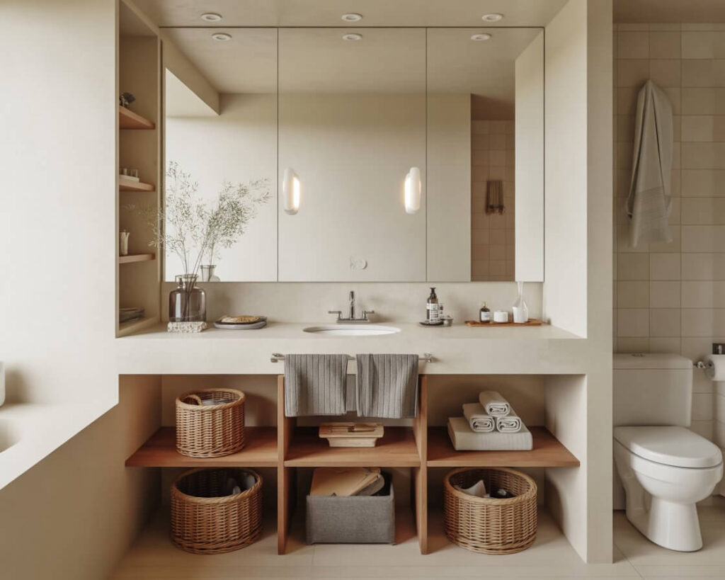 Ever noticed how spas always use open shelving? There’s a reason – it creates this zen, uncluttered vibe that makes you want to actually spend time in your bathroom.