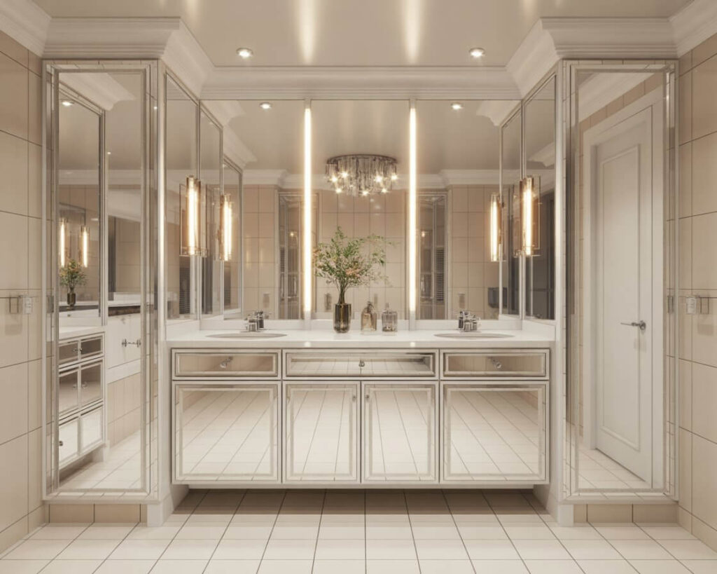 Mirrored vanities aren’t just about looks though. They’re surprisingly practical for checking your outfit from multiple angles. Plus, they hide fingerprints better than you’d think!