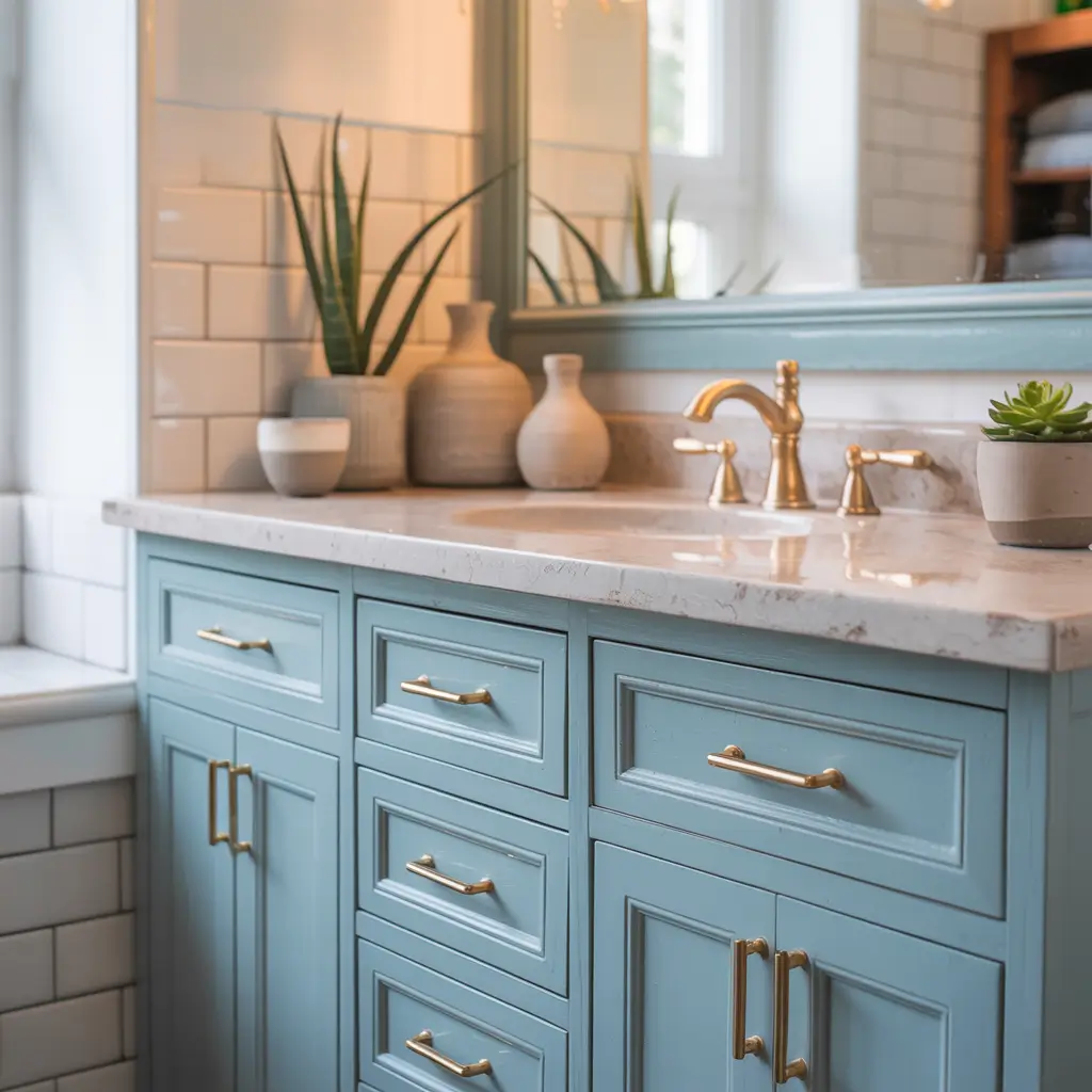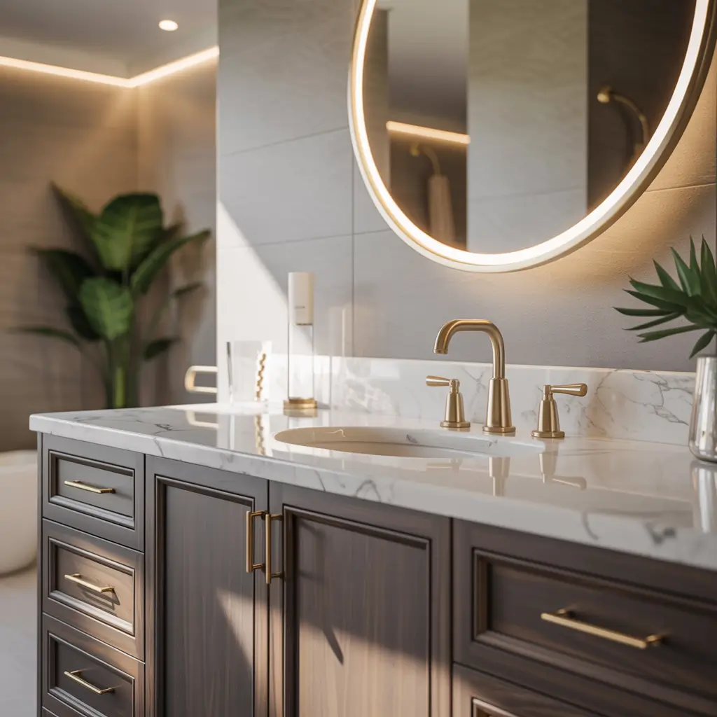I transformed my master bathroom vanity in one afternoon by replacing the builder-grade chrome hardware with brushed gold pulls and faucet. Added a statement light fixture above the mirror, and suddenly my basic vanity looked custom. Total cost: $320. Perceived value increase: easily $2,000.