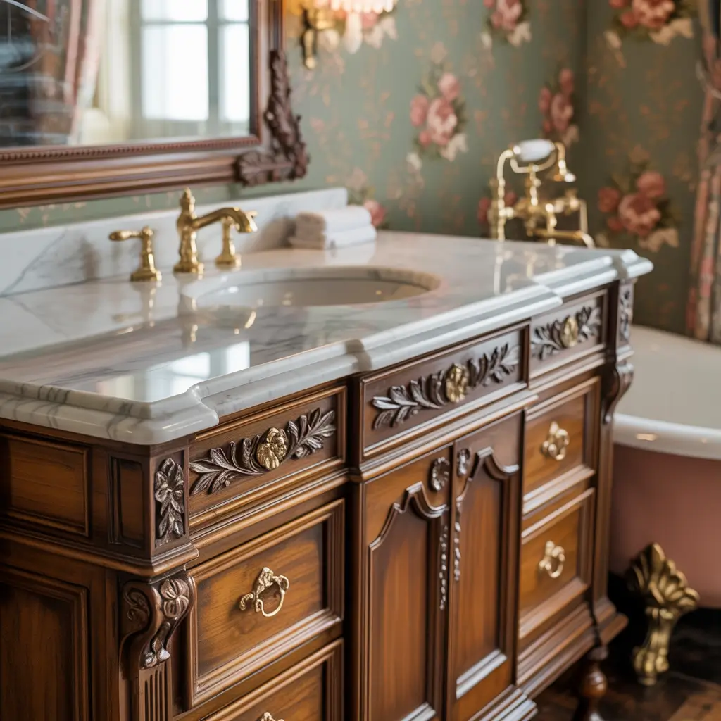 Vintage revivals bring old-world charm to dated vanities through careful updates that enhance rather than hide their age. This works spectacularly on solid wood vanities from the ’50s through ’80s.