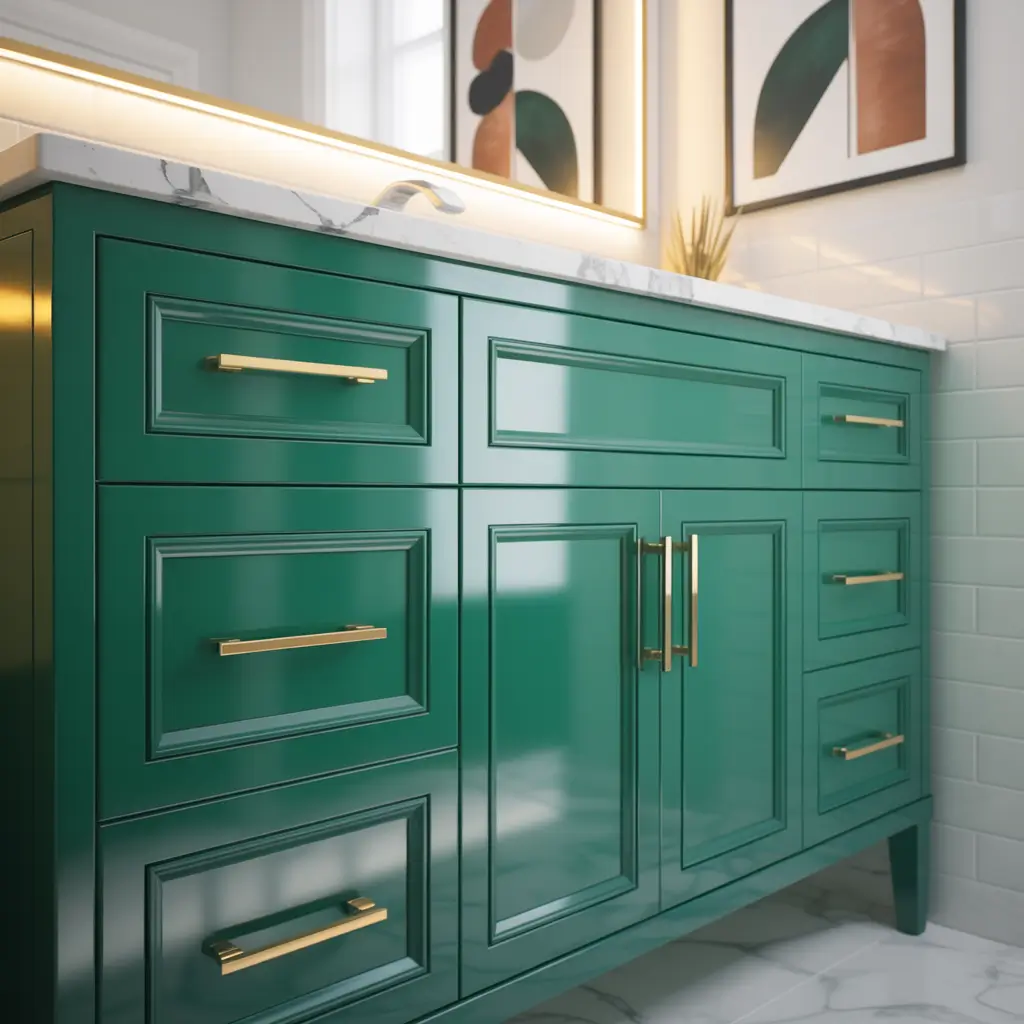 I painted my powder room vanity emerald green on what might’ve been a wine-fueled whim (no regrets). That single color choice transformed the entire bathroom from forgettable to “can I see your bathroom?” The bold color against white walls creates drama that neutral vanities simply can’t achieve.