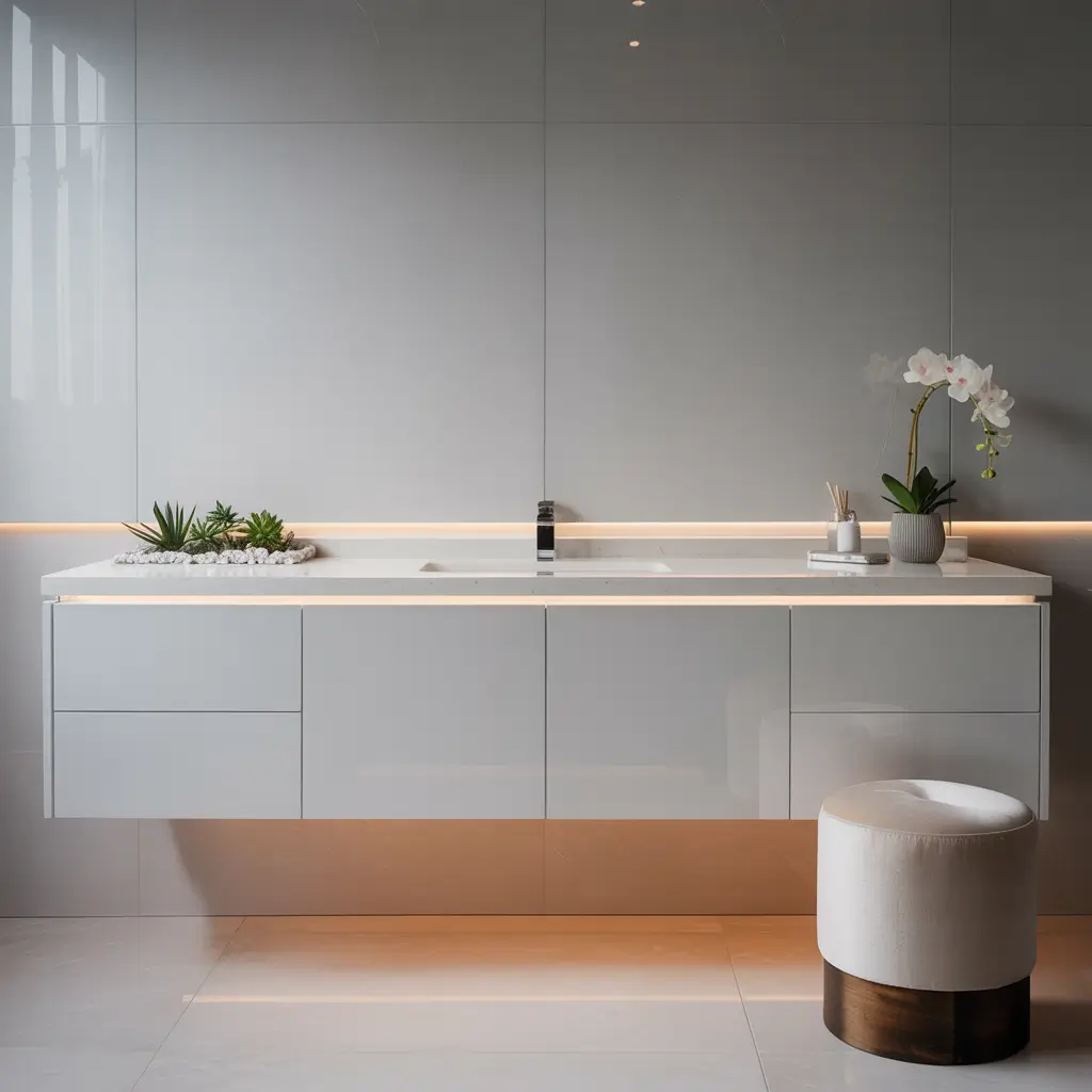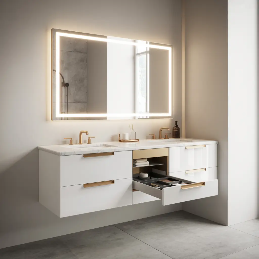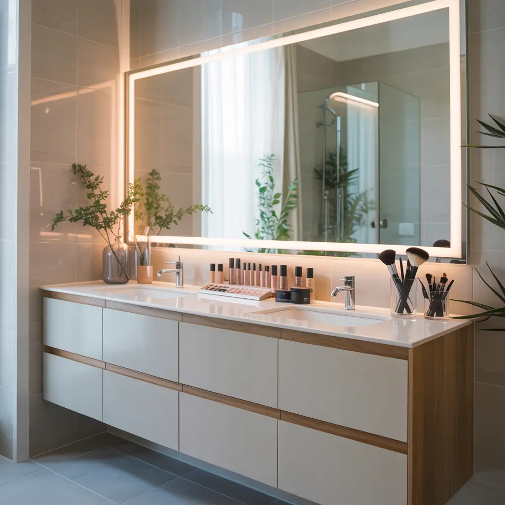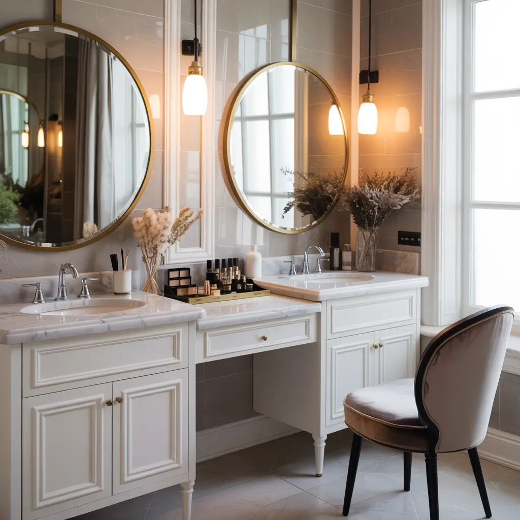 Minimalist doesn’t mean minimal function. Modern vanities with integrated makeup mirrors prove you can have clean aesthetics AND a killer makeup setup. The key is seamless integration – everything built-in, nothing cluttering the counter.