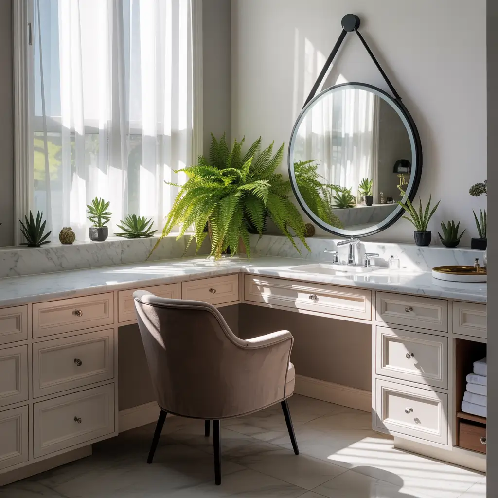 3. L-Shaped Vanity with Built-In Makeup Nook