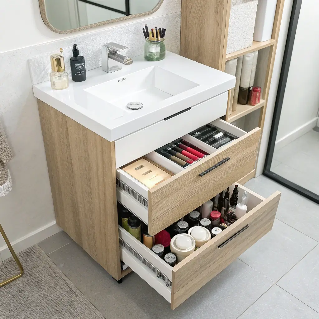 Living in a tiny bathroom doesn’t mean sacrificing your makeup game. Pull-out makeup drawers maximize every inch while keeping things hidden when not in use. My first apartment had a bathroom the size of a closet, but this solution made it work beautifully.