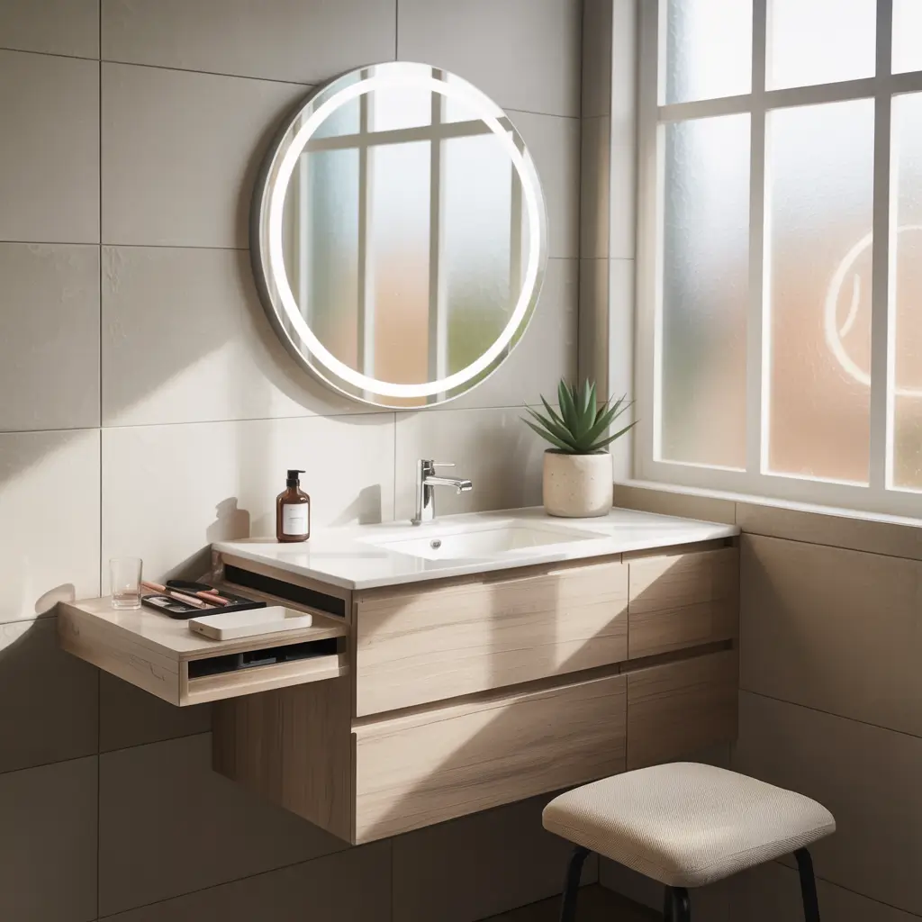 My studio apartment bathroom has this setup, and it’s genius. The makeup table folds flat against the wall when not in use, giving me actual floor space to move around. When I need it, it takes five seconds to set up.