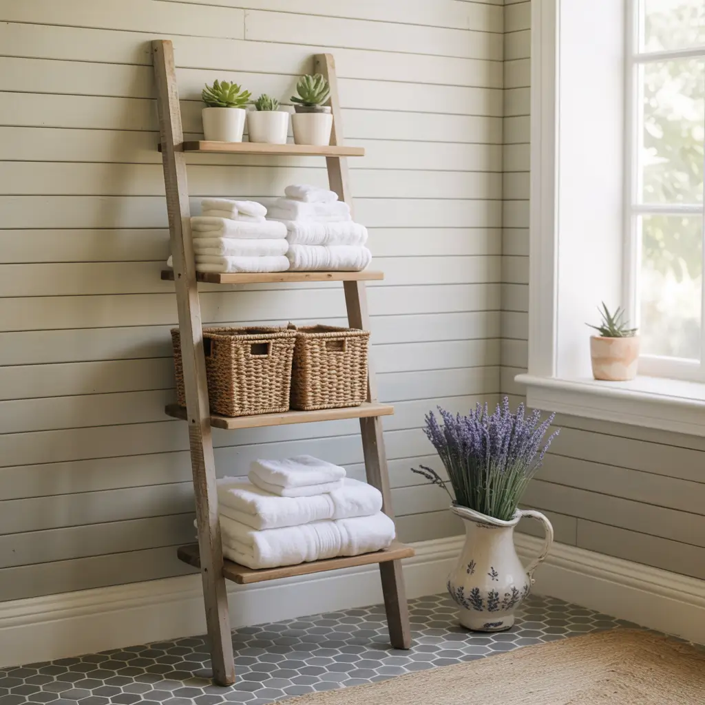 Remember when ladder shelves were everywhere? Well, they’re still here, and for good reason – they’re ridiculously versatile. A rustic wooden ladder shelf brings that farmhouse charm without making your bathroom look like a barn.