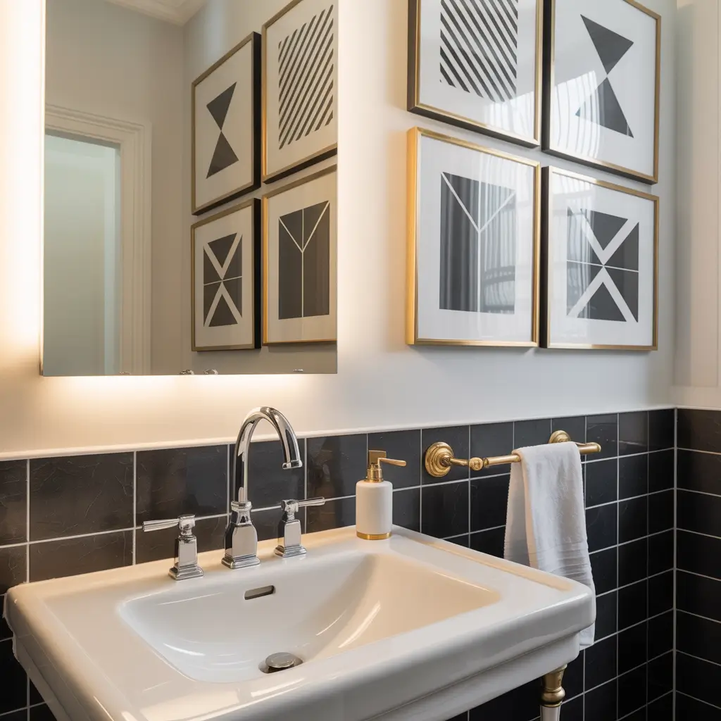 The key to geometric art in the bathroom? Balance. You want pieces that complement the existing lines in your space, not compete with them. Consider: