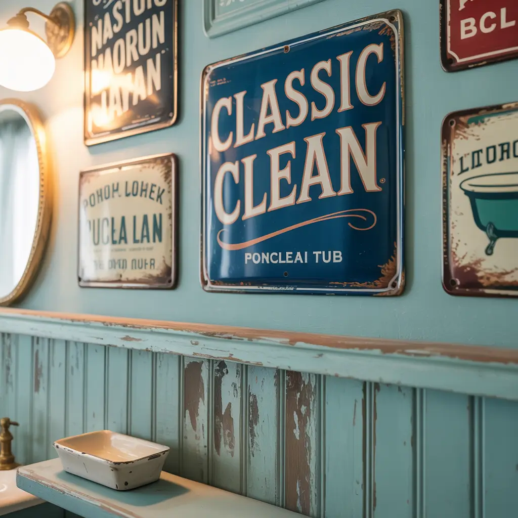 Here’s where you can inject some serious personality into your bathroom. Vintage metal signs bring character, humor, and a touch of nostalgia that makes your bathroom feel less clinical and more comfortable.