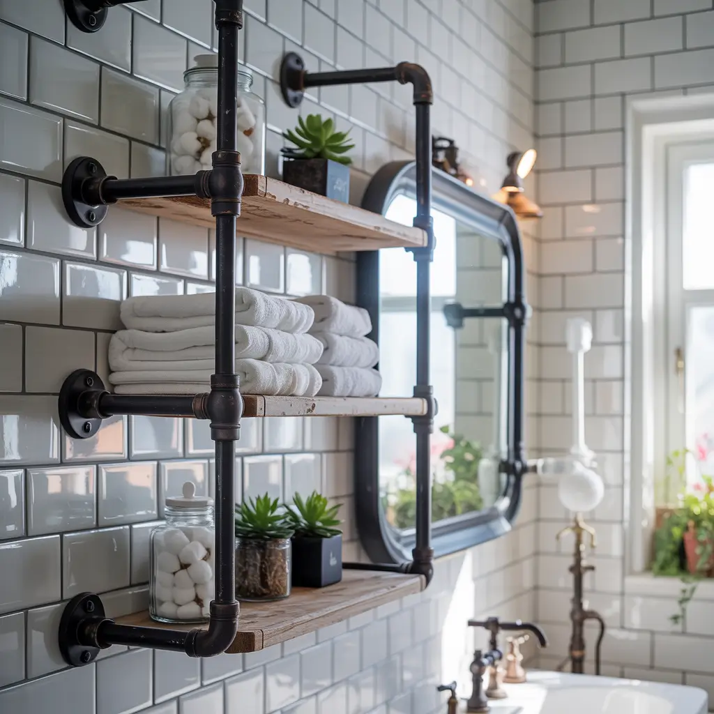 Industrial pipe shelving brings that urban loft feel to your bathroom without requiring exposed brick or concrete floors. The combination of metal pipes and wood shelves creates this perfect balance of hard and soft that works in both modern and traditional spaces.