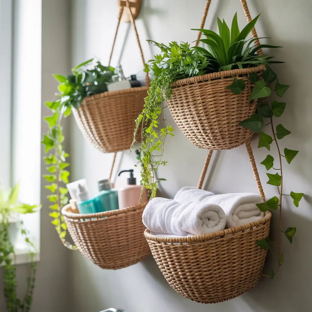 Hanging baskets are the unsung heroes of bathroom organization. They add storage without taking up precious counter or floor space, and when styled right, they look intentional rather than cluttered.