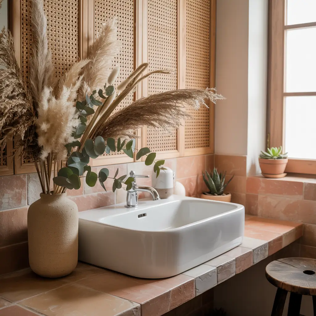 Rattan wall panels bring texture and warmth that paint simply can’t achieve. They’re like wearing a cozy sweater – for your walls. The natural material adds an organic element that softens all those hard bathroom surfaces.