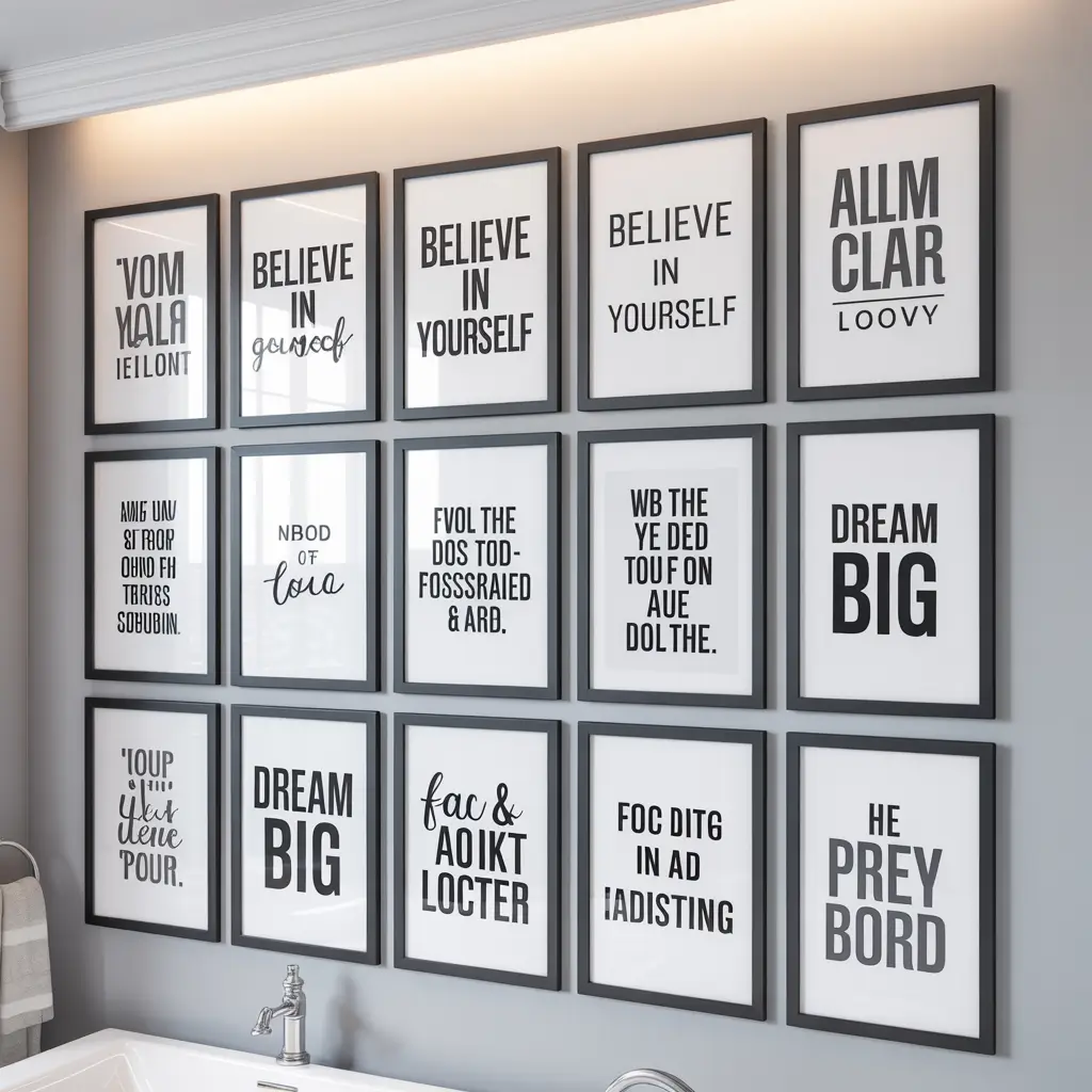 Last but definitely not least, black and white typography art brings a modern, clean aesthetic that works in literally any bathroom. Whether you go funny, inspirational, or purely decorative, typography art adds personality without color commitment.