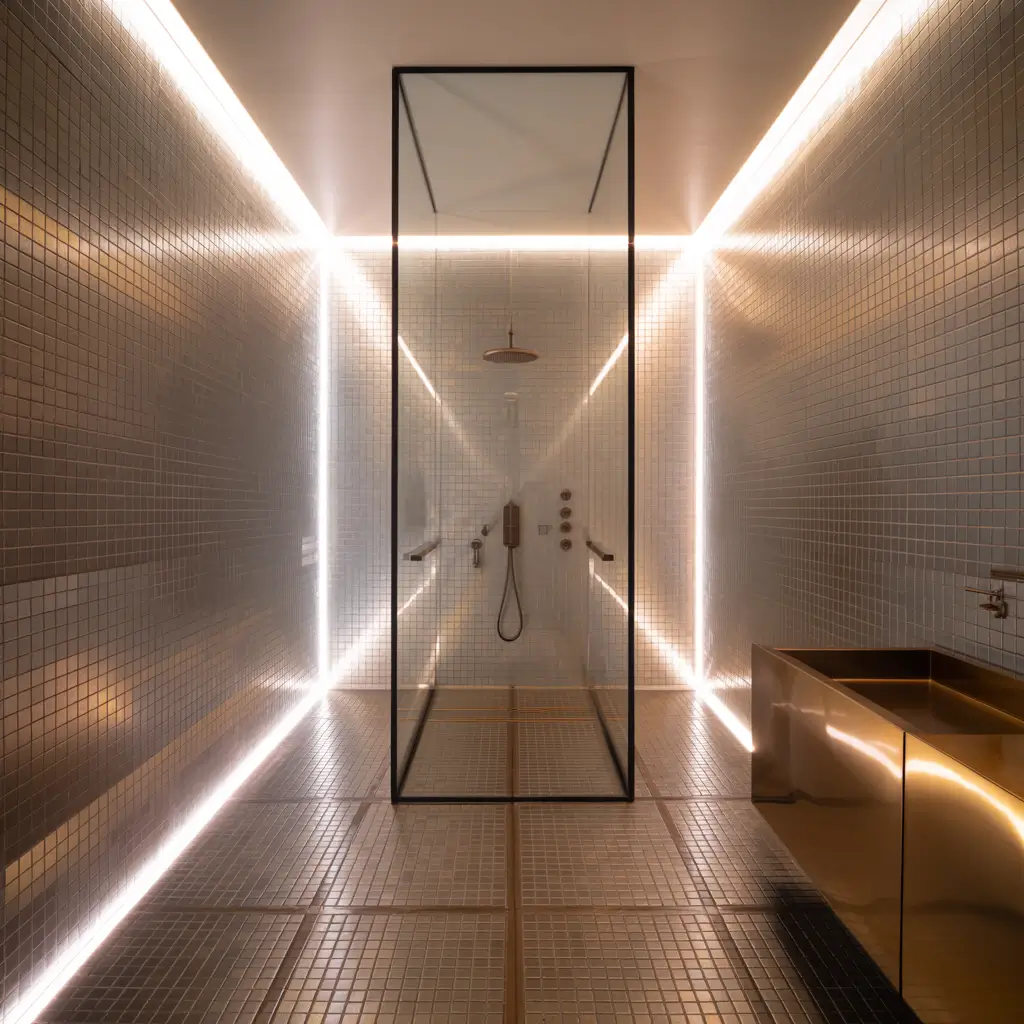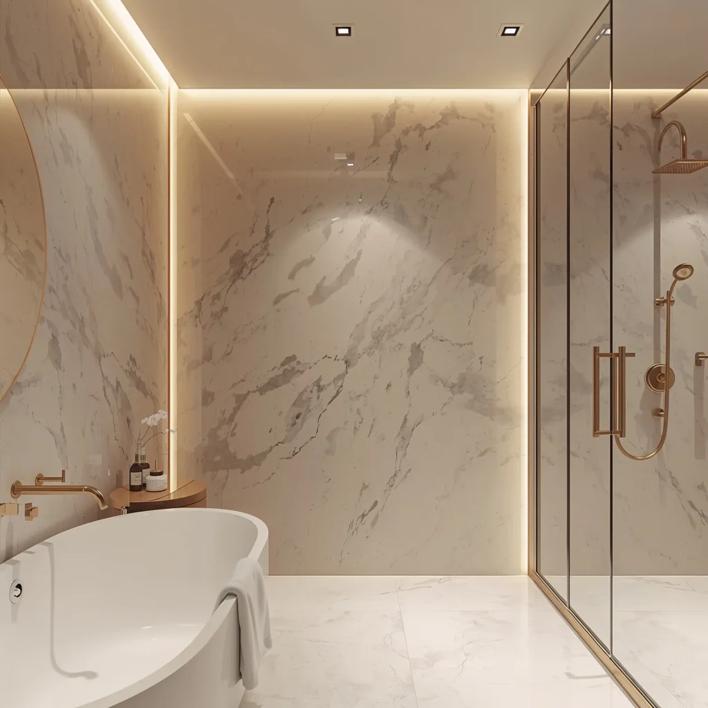 Metallic finishes add instant glamour without requiring any additional decoration. Rose gold, brushed bronze, stainless steel – each creates a different mood. Just remember, a little goes a long way. Full metallic walls might make you feel like you’re showering in a disco ball.