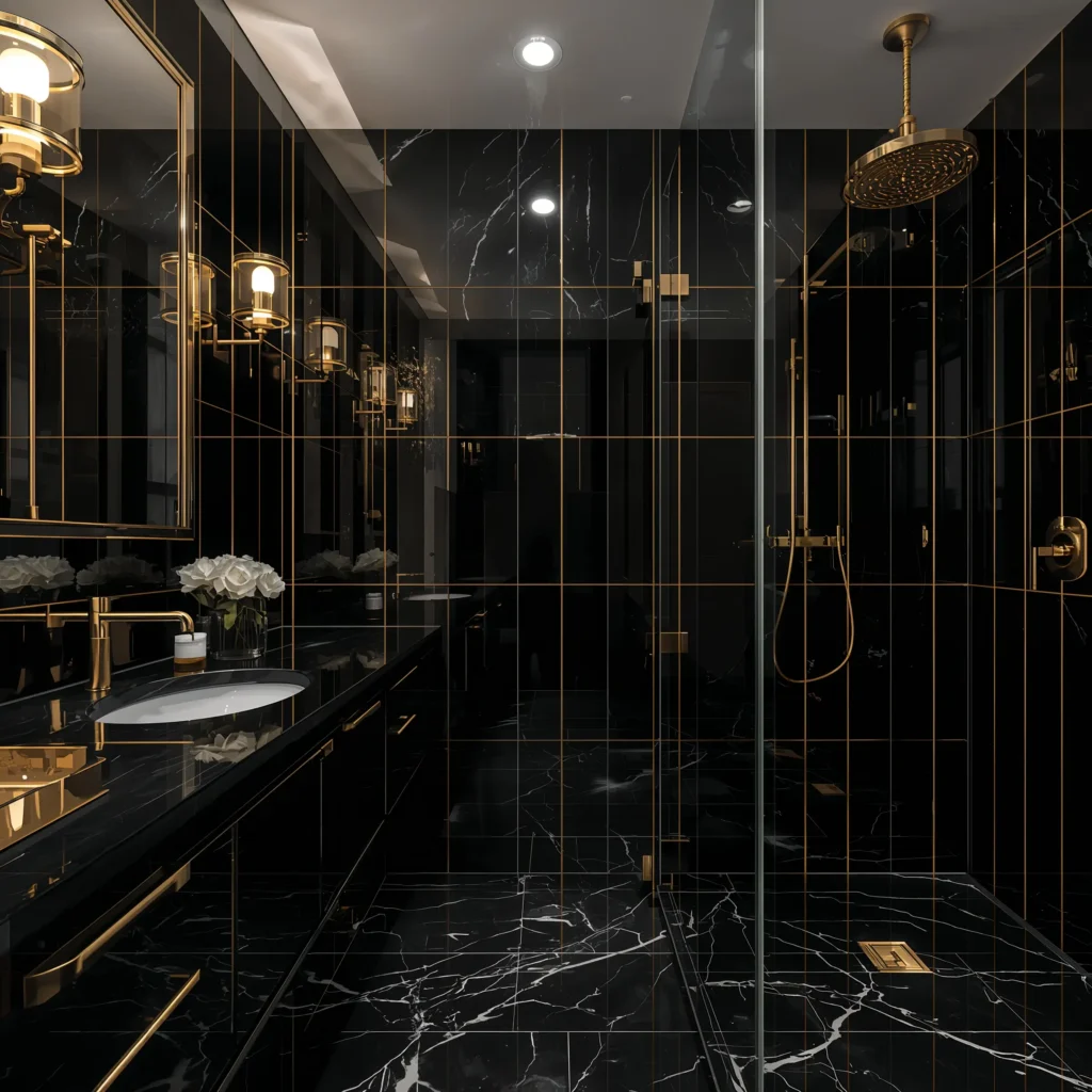 The key to nailing black and gold contrast is balance. Too much black feels like a cave, too much gold looks like Trump’s bathroom (no offense if that’s your thing). I recommend using black as your base with gold accents – think gold trim tiles, fixtures, or geometric gold inlays.