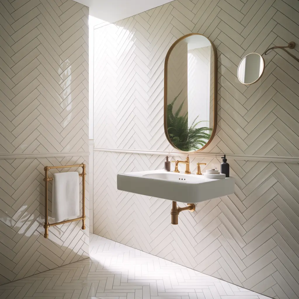 Take any tile – subway, marble, whatever – and arrange it in a herringbone pattern, and suddenly you’ve got yourself a designer bathroom. The glossy finish amplifies this effect, creating depth and movement that makes your walls look expensive (even if they’re not).