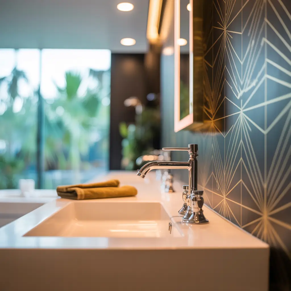 Art Deco patterns work brilliantly in bathrooms because they’re inherently luxurious. Those repetitive geometric patterns, bold lines, and metallic elements create this sense of intentional design that elevates even the most basic bathroom fixtures. Gold and black combinations are classic, but don’t sleep on emerald green or navy blue versions.