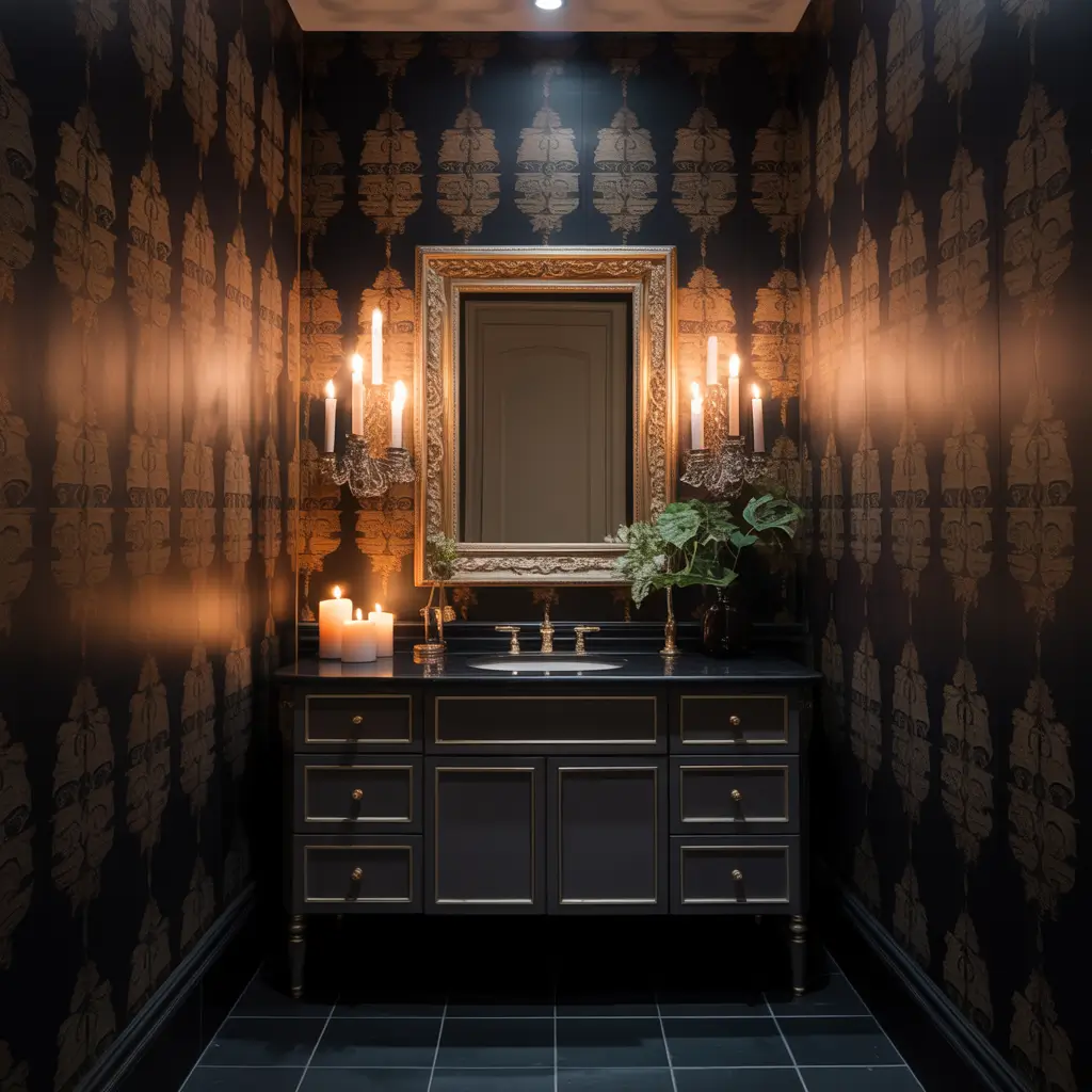 Plot twist: dark bathrooms are having a major moment, and I’m here for it. Dark, moody wallpaper creates this cocoon-like feeling that makes your bathroom feel like a private club. Think deep emerald greens, midnight blues, or rich charcoal patterns that make your white fixtures pop like stars.