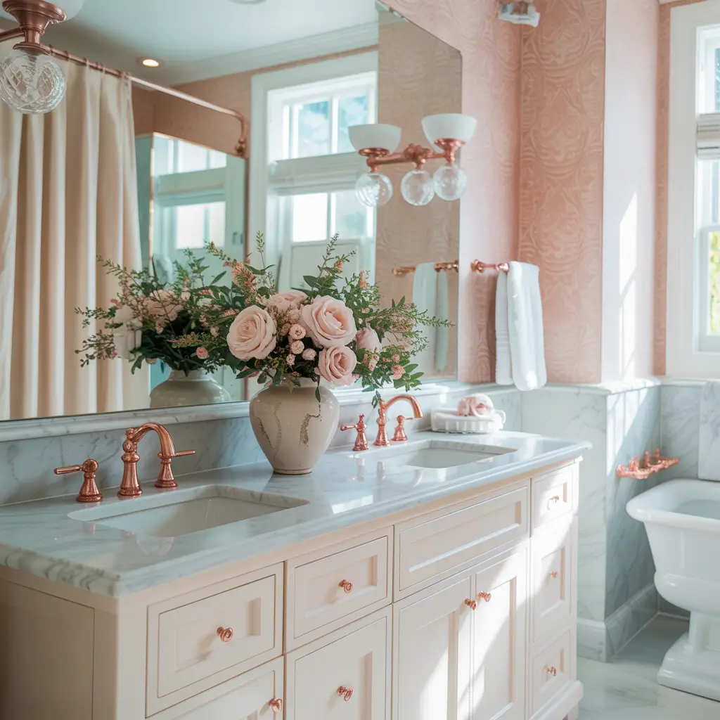 Pink wallpaper in bathrooms creates this incredible softening effect. The color naturally flatters skin tones (hello, better selfie lighting), and it pairs beautifully with both warm and cool fixtures. I installed a subtle pink geometric pattern in my bathroom last year, and even my husband admits he loves it.