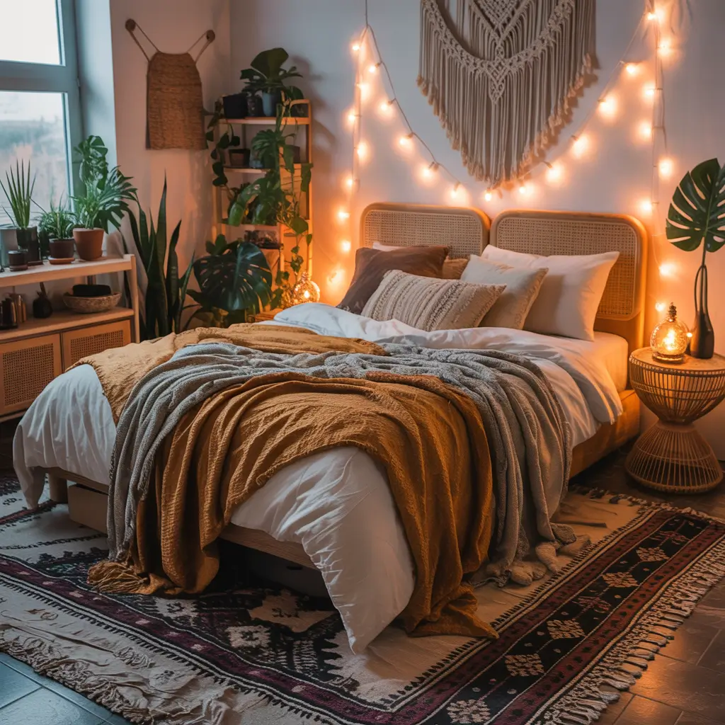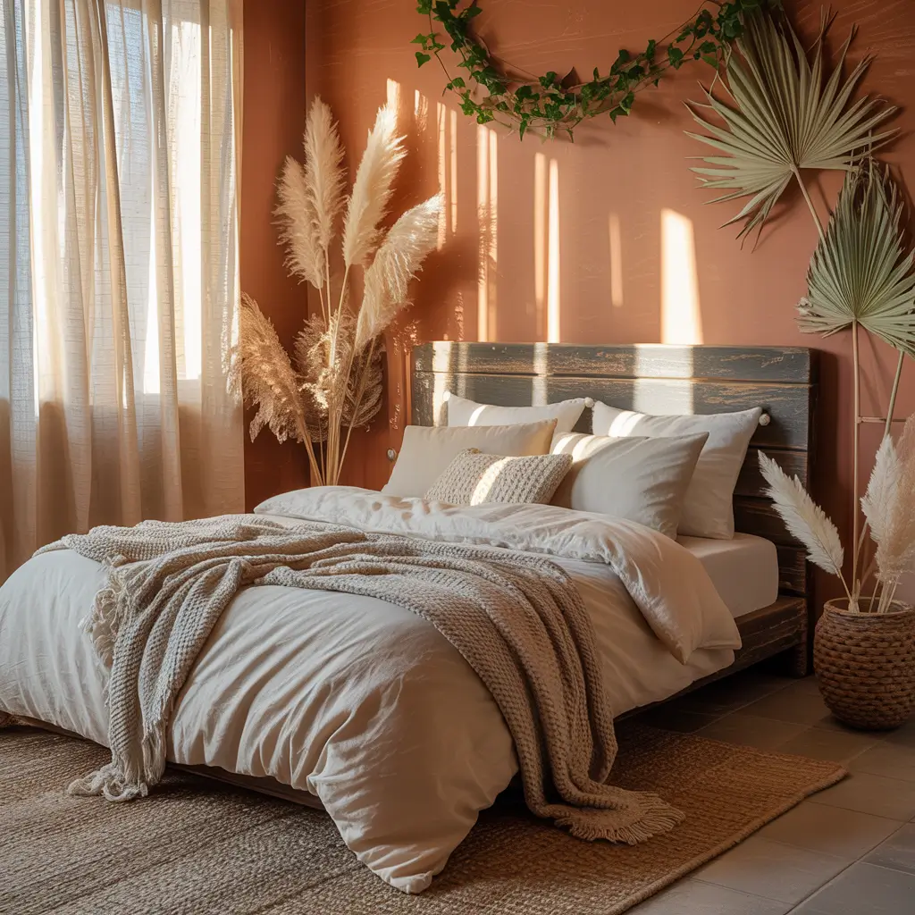 Boho can quickly become overwhelming. Keep it cozy, not chaotic by sticking to a warm color palette—terracotta, mustard, rust, cream. I learned this after my first boho attempt looked like a craft store exploded. Now I follow the “warm tones only” rule and everything magically coordinates.
