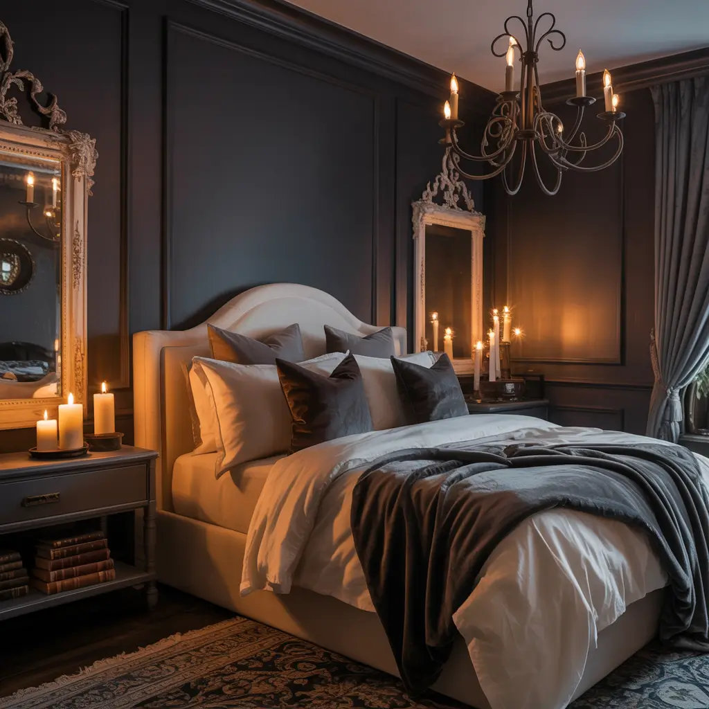 The difference between cozy dark and scary dark? Warmth in every choice. Warm bulbs, warm metals (brass or copper), warm fabrics. My dark bedroom has seven light sources because ambiance matters when you’re living in sophisticated shadows.