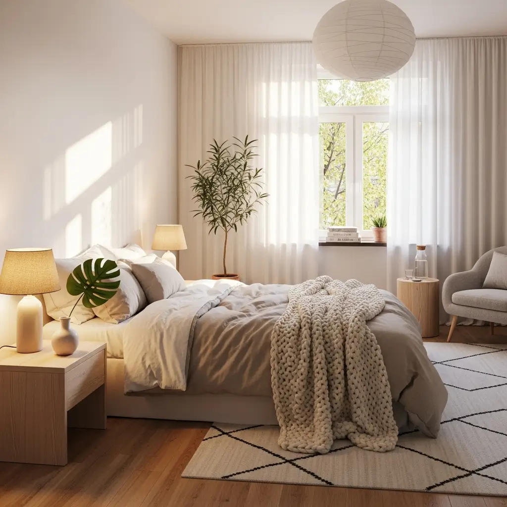 Scandi aesthetic uses a simple formula: white walls, light wood, cozy textiles, and nothing extra. My Scandinavian bedroom has more blankets than decorations, and that’s exactly the point. Function and beauty exist in perfect harmony.