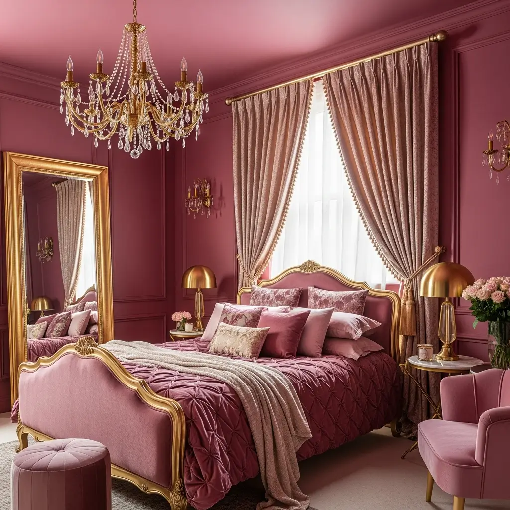 Pink and gold bedrooms define luxury without apology. This combination brings Old Hollywood glamour into the 21st century.