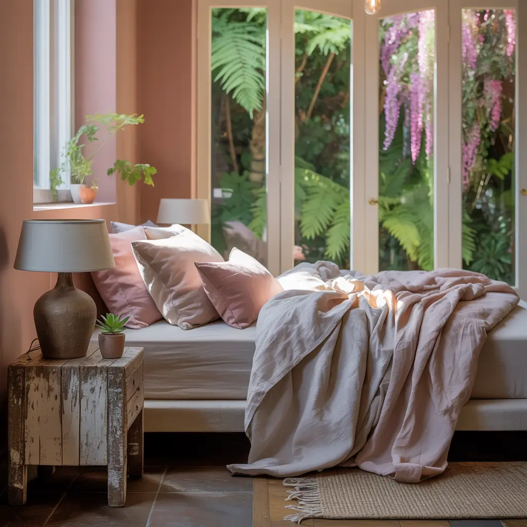 Pink and neutral bedrooms ground femininity with natural elements. This combination feels organic and sophisticated.