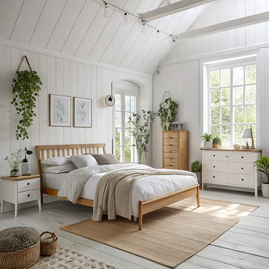 Natural materials dominate. Wood furniture in light oak or birch tones, linen bedding, wool throws, and cotton curtains connect the space to the natural world. Plants appear frequently, adding life and color without visual clutter.