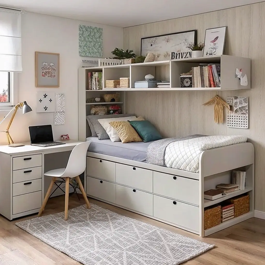 This layout treats vertical space as equally important to floor space. Tall dressers replace wide ones. Shelving climbs walls. Beds feature built-in storage drawers underneath. Nothing sits unused—every surface and volume serves a purpose.