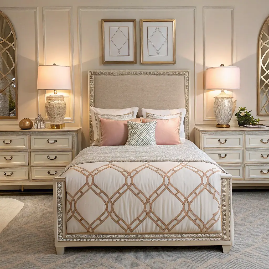 Symmetrical layouts center your bed precisely on the room’s main wall, with identical nightstands, lamps, and accessories flanking both sides. This mirror-image arrangement creates instant sophistication that reads as deliberately designed.