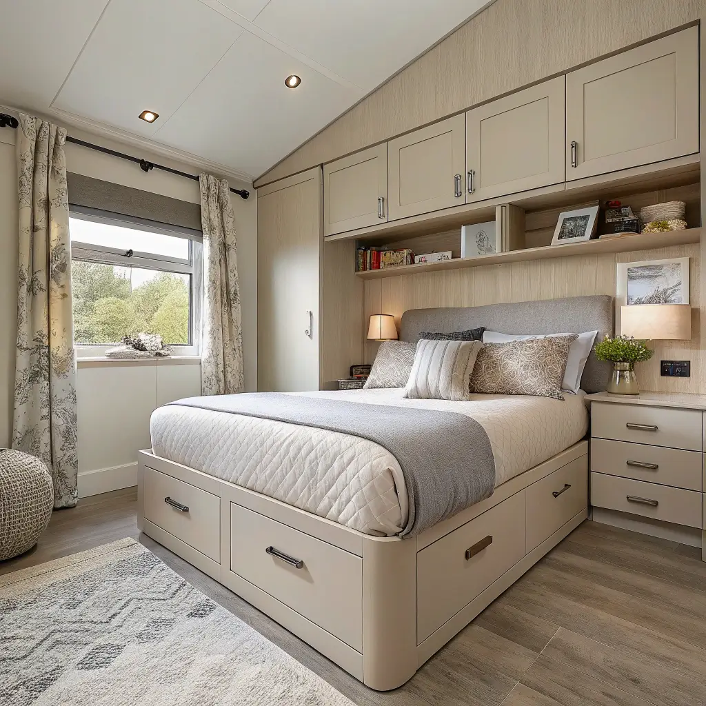 Multi-functional furniture becomes your best friend. Ottoman benches that open for storage, nightstands with multiple shelves, headboards with built-in compartments—these hybrid pieces do double duty without doubling your furniture footprint.