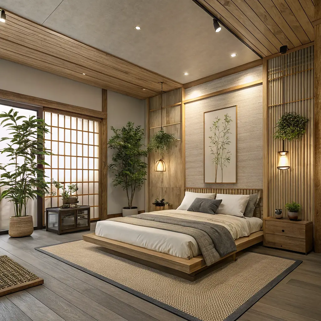 Natural materials dominate every surface. Wood flooring or natural fiber rugs. Linen or cotton bedding in neutral tones. Bamboo or paper screens for window coverage. These organic textures connect you to natural rhythms that support restful sleep.