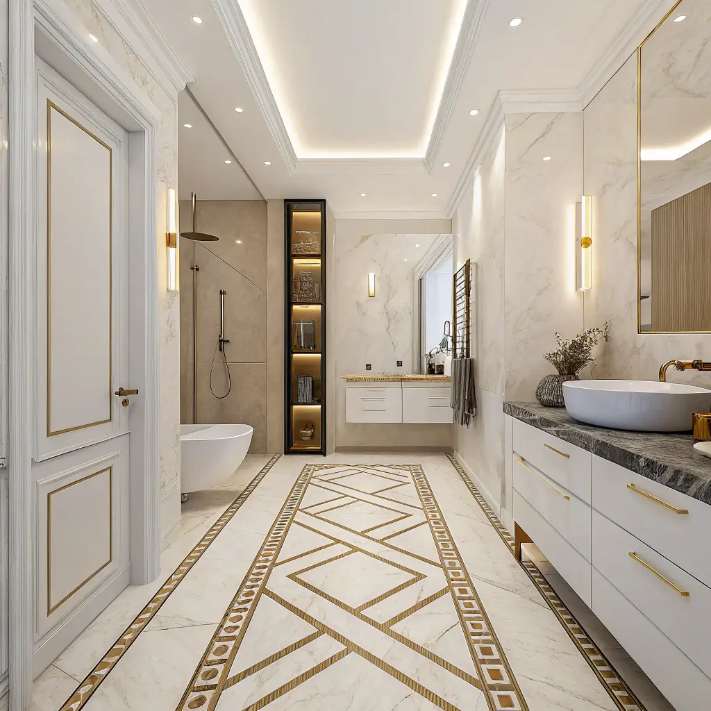 Modern doesn’t mean boring when it comes to beige marble floors. Creative patterns transform simple stone into stunning focal points. I spent weeks researching patterns before choosing a large-scale chevron for my bathroom floor, and it’s become the star of the space.