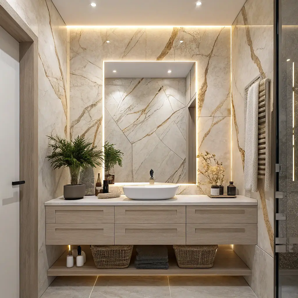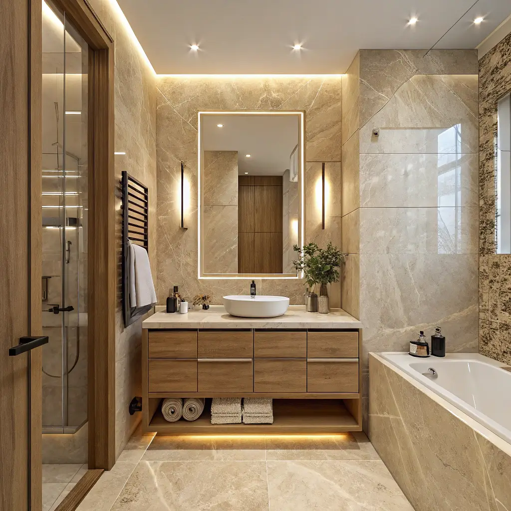 Too much wood and your bathroom feels like a sauna. Too much marble and it loses that contemporary edge. I follow a 70-30 rule – 70% marble to 30% wood accents. This keeps the space feeling luxurious while adding enough warmth and texture to feel current and livable.