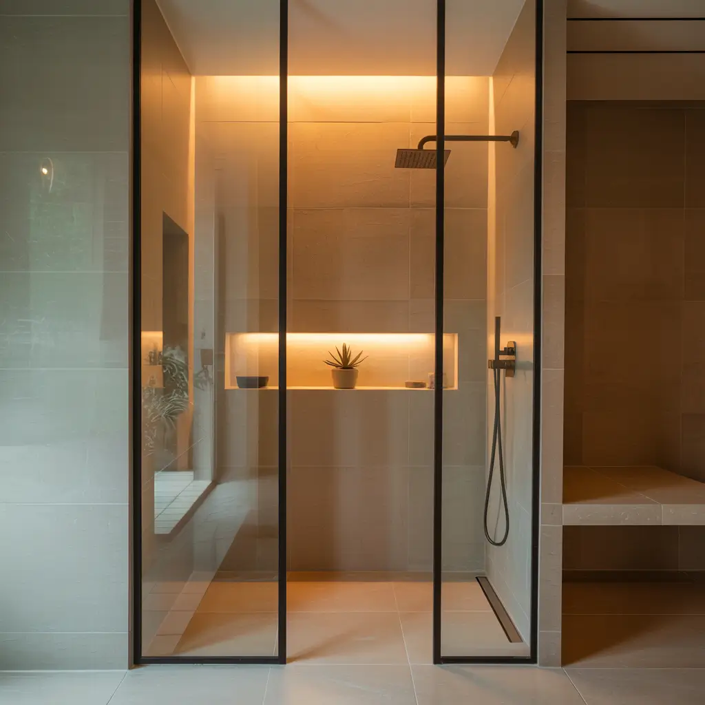 My current shower features floor-to-ceiling beige tiles behind frameless glass, and the space feels massive. The continuous sight lines make our average-sized bathroom feel like a luxury suite.