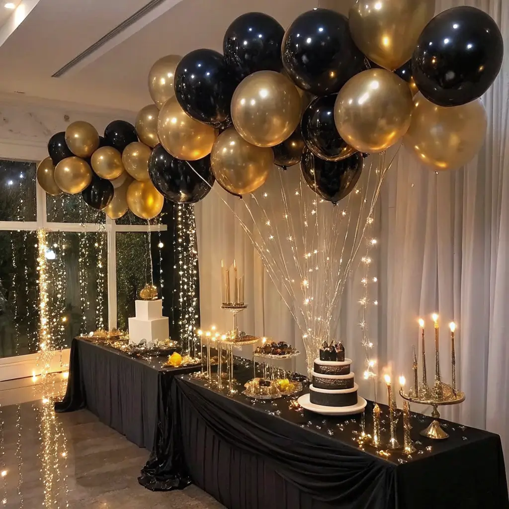 Metallic balloons in gold and black add height and drama. I like to create balloon bouquets with different sizes – some large statement balloons mixed with smaller ones creates visual interest.
