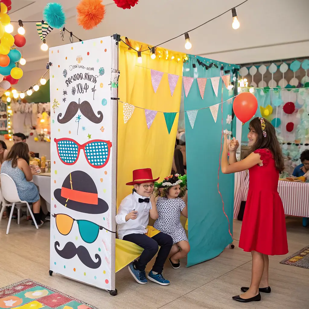 Every party needs a photo booth, but you don’t need to rent one. Creating your own interactive corner is way more fun and gives you complete creative control.