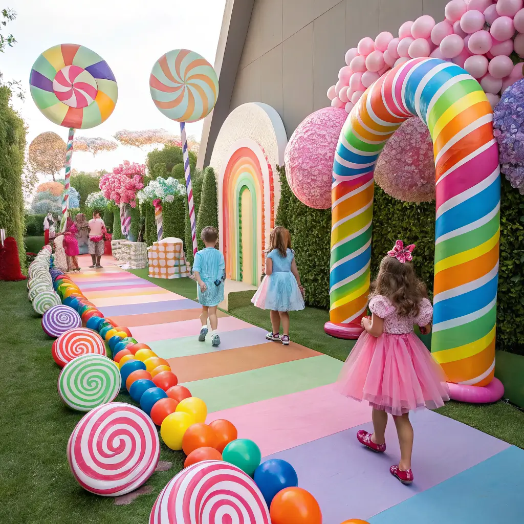 Oversized candy decorations are your main event. You can buy these or make them yourself using pool noodles, foam, and paint. Giant lollipops, gummy bears, and candy canes create that whimsical Candy Land board game feeling.